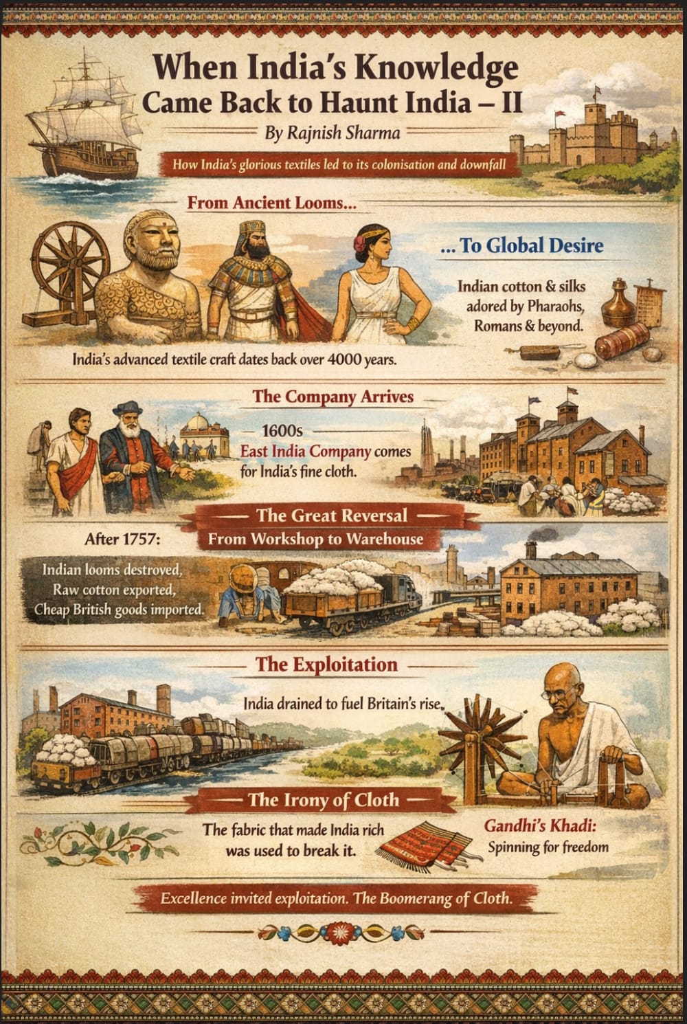 जिस तरह भारत के गणित ने यूरोप को ऊपर उठाया और बाद में वही ज्ञान गुलामी की जंजीर बनकर लौटा, उसी तरह हमारे कपड़ों के साथ भी यही दुखद कहानी दोहराई गई।